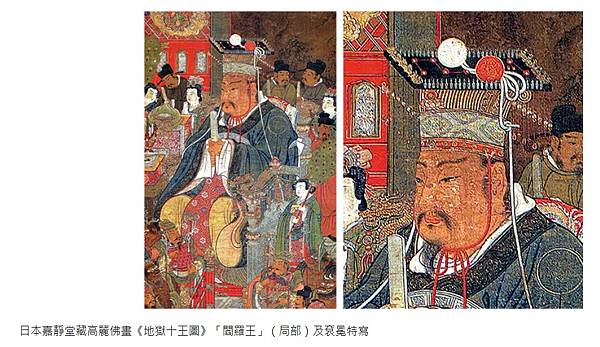 日本嘉靜堂藏高麗佛畫《地獄十王圖》「閻羅王」(局部)及袞冕特寫