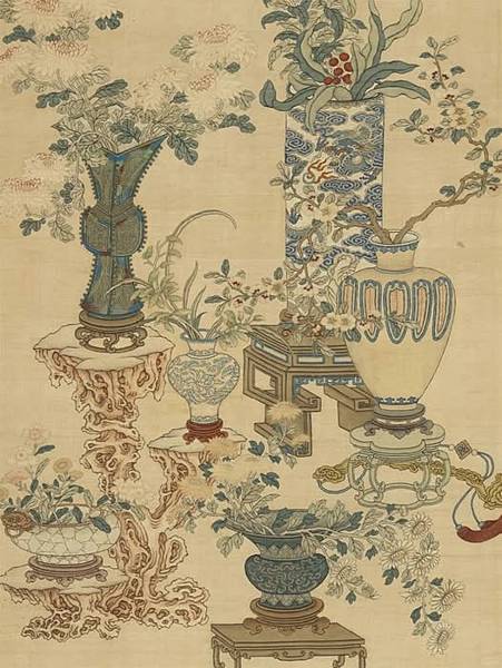 國立故宮博物院緙絲,圖版79、80&*1.本社,〈清乾隆緙絲博古花卉集錦軸〉,《故宮文物月刊》,第46期(1987年1月),封底。清乾隆緙絲博古花卉集錦 軸-數位典藏與學習聯合目錄 https://bit.ly/4bZvzUa