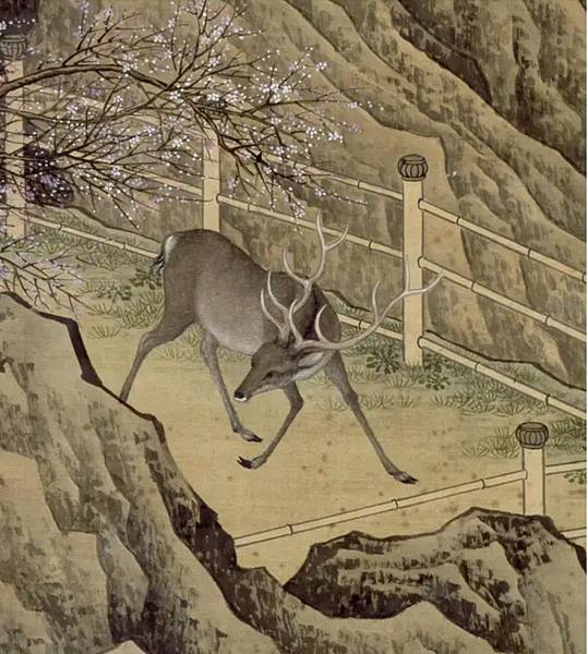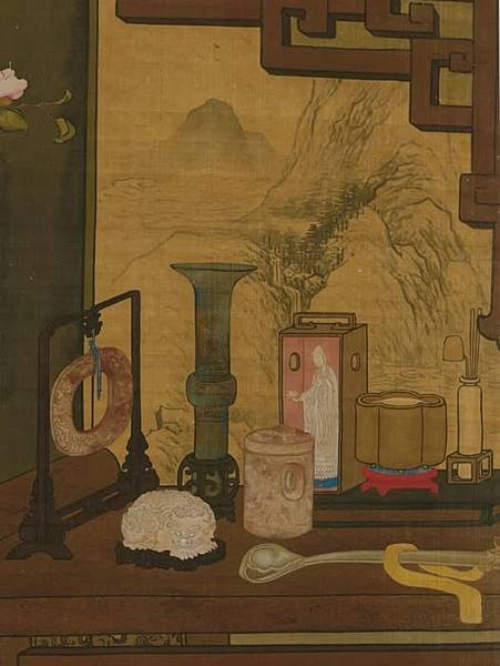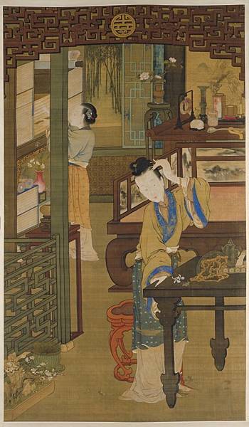 能在解說牌上標註姓名的,不是一般泛泛的宮廷畫師。這幅畫標註著畫師的名字"金廷標"。我Google了一下網路介紹資料,這位畫師原本只是一位民間畫師,乾隆老爺二次下江南的時候,他自薦進呈《白描羅漢圖》,受到乾隆皇帝賞識入院進宮,成為宮廷畫師。在宮裡工作10年,因病辭世。根據《國朝院畫錄》記載,他工於人物、花卉,約有八十餘件作品,數量僅次於張宗蒼、丁觀鵬。這次北京故宮所帶來華盛頓D.C.展出的是金廷標工筆仕女畫的代表作《簪花仕女圖》。在畫面中心的仕女正對著桌上的銅鏡,準備插上蘭花簪,負載桌上的還有蝶簪、白蘭、僧帽托盤上的杯壺。沿著對角的窗望去,後方的床,旁邊整理書架的丫鬟,後方高几上的玉璧、青銅觚、如意、獸型紙鎮,一直到窗外向遠方收斂的竹林。金廷標成功地營造出深景的視覺空間。在參考資料:楊婉瑜,《清乾隆宮廷畫師——金廷標繪畫研究》文裡提到:「...從畫幅縱 223 公分,橫 130.5 公分的尺寸、空間深遠感,以及畫面上方回字紋門框看來,筆者推判此作應原是用以裝潢壁面的貼落,日後皇帝命人取下後再作立軸裝裱。」這與之前筆記《嘉慶皇帝童年畫像》故宮專家的說法一致。讓人對這幅畫當時在宮裡牆上的情景有很多想像空間。歷史背包客的筆記本: 金廷標繪《簪花仕女圖》 https://bit.ly/4bXAepW