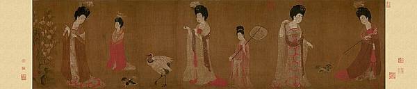 此畫上共有仕女五人、女侍一人,此外還有猧子狗、白鶴和辛夷花。六位女子均著低胸長裳、頭插步搖,「圓臉、蛾眉、長項、削肩」,除去女侍之外均有簪花。畫上有宋高宗「紹興」印、賈似道「悅生」印、安岐印等[2]。