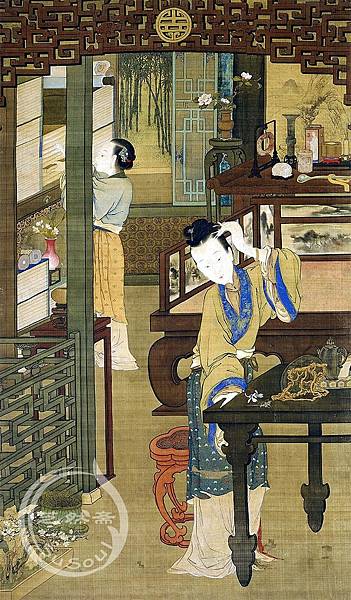 ▪圖中精致的家具、富麗的陳設所構筑出的典雅高貴的環境,表明此圖表現的是宮廷女子日常生活的景象。梳妝打扮是貴族婦女每日生活中的重要內容之一,對此,她們不敢有絲毫的怠慢。