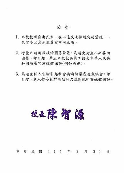 第二點聲明提到因為「兩岸政治關係緊張」,怕衍生困擾,禁止該校教職員工接受中共所屬官方媒體的訪問。本來是中共單方面的處處對台灣挑釁,卻說成「關係緊張」,這有一點是雙方各打一巴掌,雙方都要檢討,不該彼此造成緊張局面。然而台灣和中國的實際情況,卻是台灣想要和平都不可得,因為中共一直把「台灣是中國的內政問題」當作政治籌碼,作為對外擴張、對內鎮壓的合理說法,兩岸的緊張罪魁禍首都是中共。