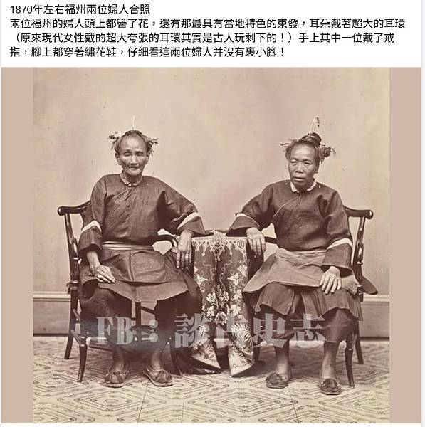 兩位福州的婦人頭上都簪了花,還有那最具有當地特色的束發,耳朵戴著超大的耳環(原來現代女性戴的超大夸張的耳環其實是古人玩剩下的!)手上其中一位戴了戒指,腳上都穿著繡花鞋,仔細看這兩位婦人并沒有裹小腳!