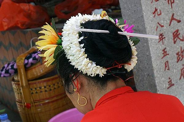 蟳埔女喜愛戴花。用繩子將鮮花串成花環,一般有3-5圈,每圈用一種花,圍繞著螺旋髻佩戴在腦後,稱為「簪花圍」。蟳埔女使用的簪花圍基本來自附近的雲麓村,那裡由於蟳埔女的需求而形成了的鮮花種植產業和市場。