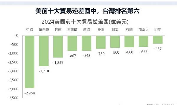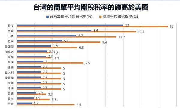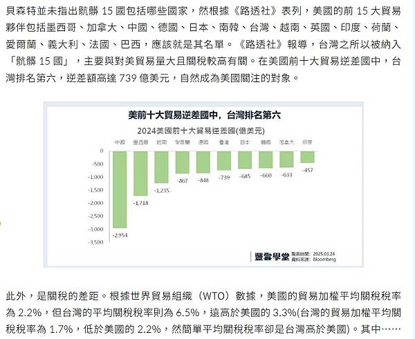 貝森特並未指出骯髒 15 國包括哪些國家,然根據《路透社》表列,美國的前 15 大貿易夥伴包括墨西哥、加拿大、中國、德國、日本、南韓、台灣、越南、英國、印度、荷蘭、愛爾蘭、義大利、法國、巴西,應該就是其名單。《路透社》報導,台灣之所以被納入「骯髒 15 國」,主要與對美貿易量大且關稅較高有關。在美國前十大貿易逆差國中,台灣排名第六,逆差額高達 739 億美元,自然成為美國關注的對象。此外,是關稅的差距。根據世界貿易組織(WTO)數據,美國的貿易加權平均關稅稅率為 2.2%,但台灣的平均關稅稅率則為 6.5%,遠高於美國的 3.3%(台灣的貿易加權平均關稅稅率為 1.7%,低於美國的 2.2%,然簡單平均關稅稅率卻是台灣高於美國)。 https://bit.ly/3QUMqhp