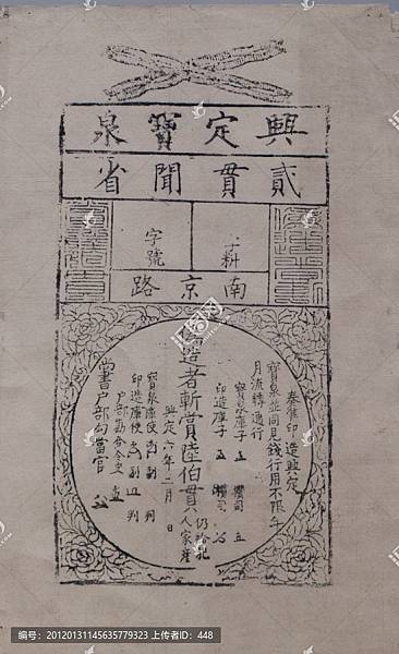 會子印樣。中間有橫行大字「行在會子庫」,指臨時首都管理會子的部門。右上方印「大壹貫文省」,左上方印「第壹佰拾料」,中間印「敕偽造會子犯人處斬 賞錢壹阡貫 如不願支賞 與補進義校尉 若徒中及窩藏之家能自告首 特與免罪 亦支上件賞錢 或願補前項名目者聽」