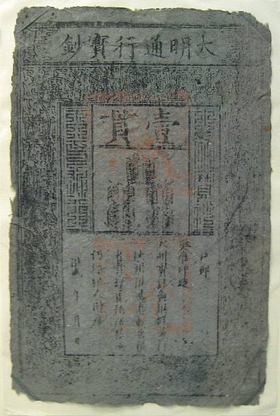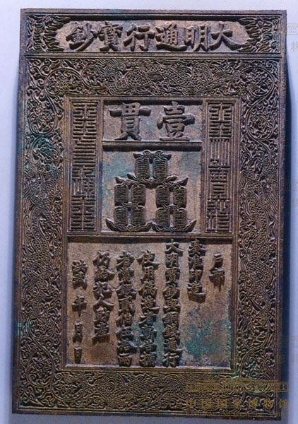 大明寶鈔是明朝官方發行的唯一紙幣,該紙幣貫行於明朝二百七十多年。明太祖洪武八年(1375年)始造。由於當時缺銅,朝廷「責民出銅,民毀器皿輸官」,於是明洪武七年頒布「鈔法」,設寶鈔提舉司,其下再設抄紙、印鈔二局和寶鈔、行用二庫。並於次年以中書省名義發行。洪武八年,「禁民間不得以金銀物貨交易,違者罪之。」禁止民間用黃金、白銀買賣交易。至洪武二十七年八月,因「鈔法阻滯」,民間不願用,「詔禁用銅錢」,「令有司悉收其錢歸官,依數換鈔,不許更用銅錢行使。限半月內,凡軍民商賈所有銅錢悉送赴官,敢有私自行使及埋藏棄毀者罪之。」強制人民使用寶鈔,把超發紙幣當作了彌補財政虧空的手段並加以濫用,赤裸裸榨取民間財富。[1][2]