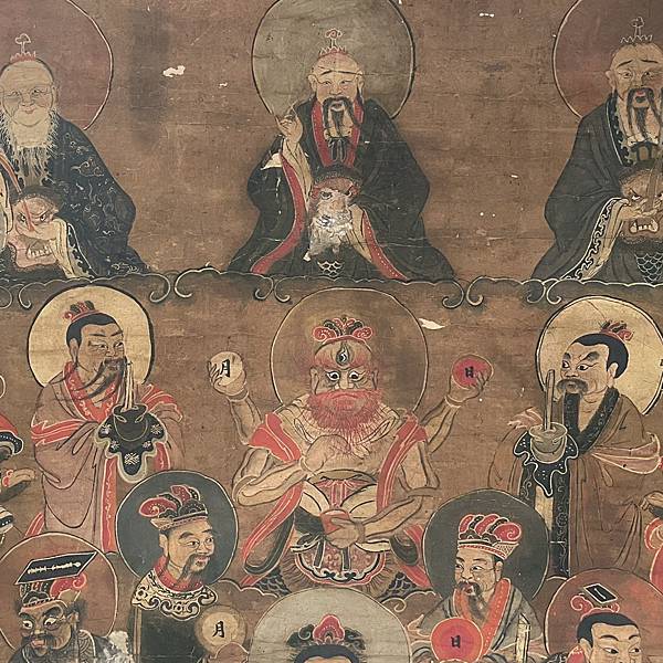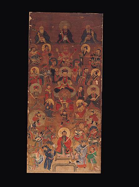三清以下(四御),即是三界眾神,尊卑有序,其正中一列所尊奉者,表現地方性信仰亦可列於道教神譜中,如觀音手執拂塵;坐於蓮花座上;又有《封神演義》中的哪吒、金吒及木吒,均腳踏火輪,為民間崇奉的信仰特色;又將達摩與玄武(玄天上帝披髮持劍)分列左右。唯整體上仍多道教神系:如盤古王兩手分持加明,其下兩側為日、明之神;其最下層為張道陵天師,左手持笏,右手捏抉,為火居道所尊崇。
