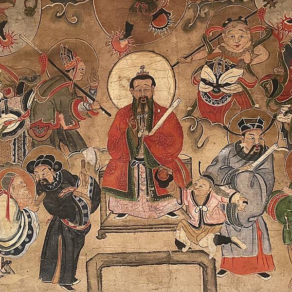 總真圖的構圖,多以中央一排為尊,兩旁再安排對稱性的左右班,與朝元圖的左右壁相近。如第三層較外對稱的一組即是青龍、白虎,其服色為青、白(非全白);內一組則服色、衣緣為紅、黑,應是朱雀、玄武。第三組一樣是左右各兩位,也是用服色象徵四方,為四御。第四層則是三官大帝(天官、地官、水官),乃是總真圖上常見的三界眾神之主,也會單獨一軸出現。