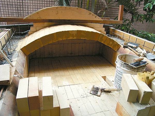 許多人看到磚造柴燒麵包窯都為它的外型感到興奮。其實,麵包窯最重要的是外表看不到的窯體,也就是四面八方都有耐火磚,保溫層和隔熱層共三層築起的構造。除了耐火磚,另外兩層都是用耐熱水泥拌上不同材質澆灌約40公分厚。