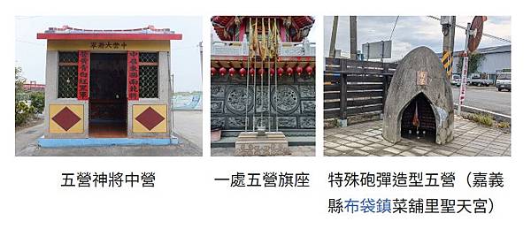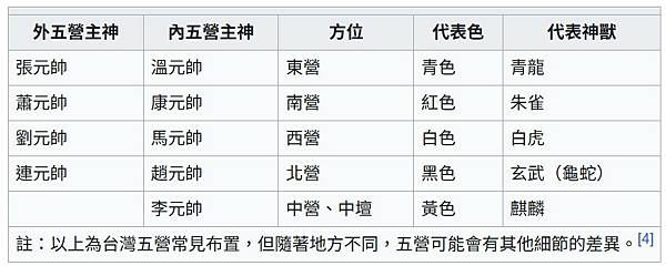 內外營:以臺灣民俗信仰而言,五營的構成又分為兩部分:內營神兵神將為正神之進衛軍的概念;外營則是以該廟之方圓為範圍,設置於村莊的五個方位地點。
