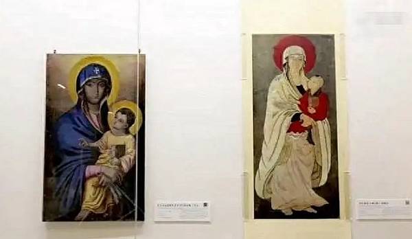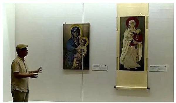 當時的展覽策劃人,同時也是美術學院教授的李軍對展品進行了介紹。這兩幅畫被並列布展在“聖母與觀音”版塊中,李軍介紹道:“這兩張圖如出一轍。”
