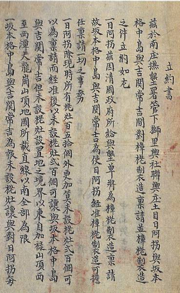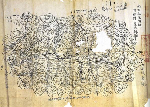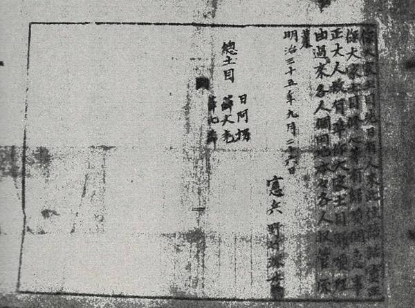 此文件為明治29(1896)年日阿拐與坂本格、中島興吉、關長吉所簽訂的契約書與手繪地圖。日治時期南庄地區共有三位頭目獲得日本政府製腦的特許,賽夏族的日阿拐為其中一位。南獅里興社社長日阿拐以每個月500圓的山租金將200個栳灶租給3人經營,並且承諾在立約範圍內不會同時承租給其他人製腦。此契約書當年簽訂時4人各持一份。