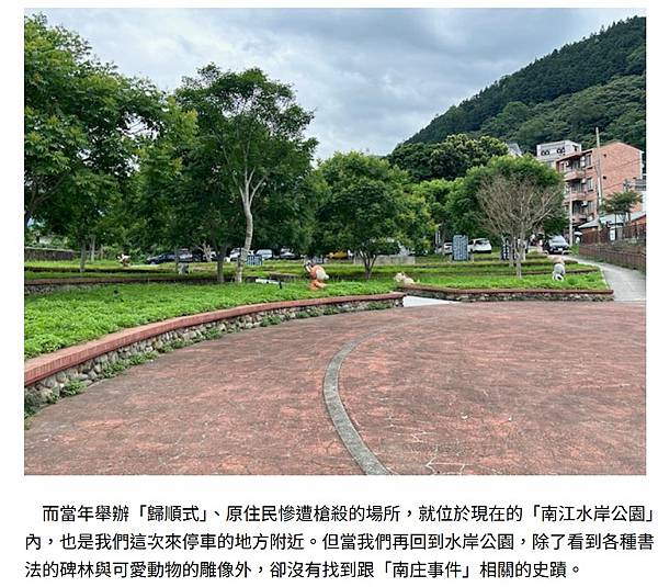 而當年舉辦「歸順式」、原住民慘遭槍殺的場所,就位於現在的「南江水岸公園」內,也是我們這次來停車的地方附近。但當我們再回到水岸公園,除了看到各種書法的碑林與可愛動物的雕像外,卻沒有找到跟「南庄事件」相關的史蹟。