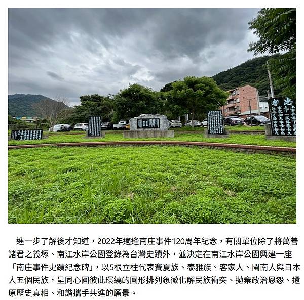 進一步了解後才知道,2022年適逢南庄事件120周年紀念,有關單位除了將萬善諸君之義塚、南江水岸公園登錄為台灣史蹟外,並決定在南江水岸公園興建一座「南庄事件史蹟紀念碑」,以5根立柱代表賽夏族、泰雅族、客家人、閩南人與日本人五個民族,呈同心圓彼此環繞的圓形排列象徵化解民族衝突、拋棄政治恩怨、還原歷史真相、和諧攜手共進的願景。