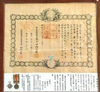 民眾出借陳園留下的「明治勳章」及獎狀。(記者劉婉君攝)