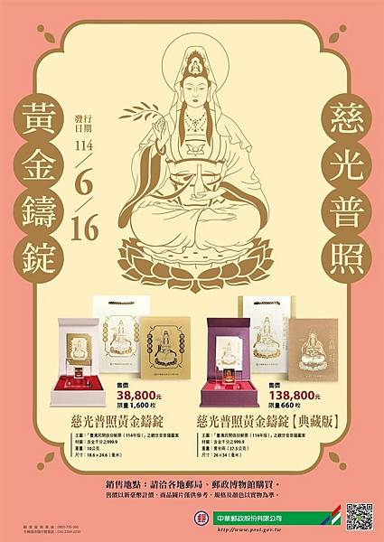 中華郵政表示,今年4月25日先是發行「台灣民間信仰郵票(114年版)」1套4枚,面值均為8元,其中包括福德正神、關聖帝君、玉皇上帝、觀世音菩薩等神明,相當受歡迎,而今日再宣布6月16日將推出「慈光普照黃金鑄錠」2款,圖像以「臺灣民間信仰郵票(114年版)」面值8元圖案觀世音菩薩為主題,委請中央造幣廠承鑄,以細膩雕刻呈現,輔以典藏包裝盒、專屬提袋及加印限量序號的精美說明卡,為極具庇佑意涵與工藝價值之珍藏品。