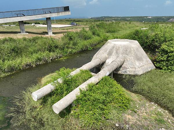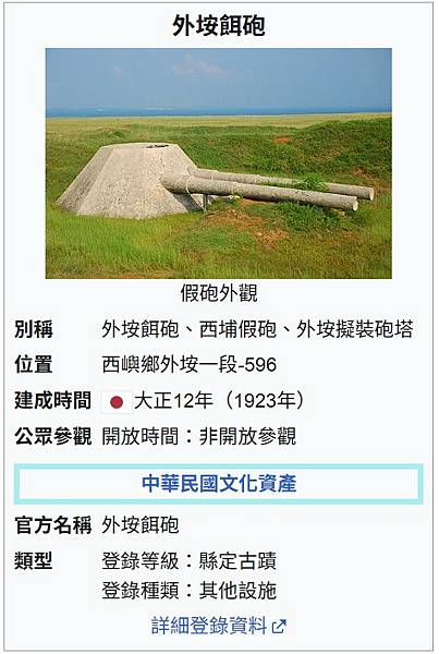 外垵餌砲,又稱「西埔假砲」,設於西埔頂,位於外垵村高地上,在前往外垵燈塔前方,位在窪地當中,是西嶼西臺前往西嶼燈塔道路旁的一座歷史建築。外垵餌砲在民國90年澎湖縣歷史建築票選中,評選為澎湖縣歷史建築十景之一。位在台地地形之窪地中,周遭以壕溝聯繫相關設施。外垵餌砲是日軍於世界二次大戰期間,為誤導美國空軍的轟炸,使用水泥蓋一座假大砲,可同時達到誘敵、欺敵的目的,所以又稱「餌砲」。這砲是用水泥製作的八角形砲座與雙砲管,是日本統治澎湖時用所蓋的假砲,砲座寬度為5.35公尺,砲管長度為6.13公尺,砲管間距為3.16公尺。餌砲是頗為稀少、特殊的軍事設施,為因應戰爭的產物,不僅是第二次世界大戰的見證,也反映外垵戰略地理位置的重要性。觀賞完漁翁島燈塔時,下山時,可以稍緩行,餌砲就在右側道路的一窪地當中,沒有注意的話,可是會錯過;歷史古蹟,值得一見,另外從這觀賞周圍風光,又是一種風情。105年在政府單位整修下,整頓與建設觀景台、涼亭等休憩設施,可以在此登高望遠外垵村景,附近景點尚有西嶼燈塔、外垵三仙塔等。【建議停留時間】 0.5小時西台餌砲(外垵餌砲) | 山富旅遊 https://bit.ly/43YgGOm