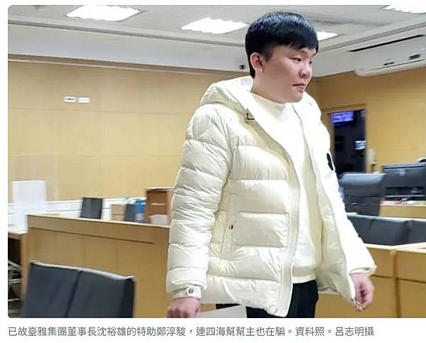 和她涉嫌共謀騙局的是他,身穿白色外套的鄭淳駿,曾擔任臺雅集團已故董事長的特助,聯手詐欺的對象就是前老闆。