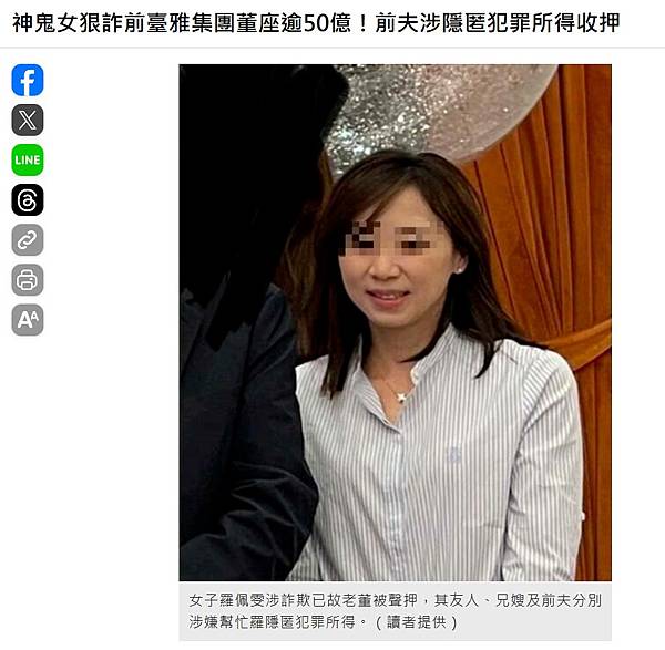 神鬼女狠詐前臺雅集團董座逾50億!前夫涉隱匿犯罪所得收押 - 社會 - 自由時報電子報 https://bit.ly/4jT5Pve