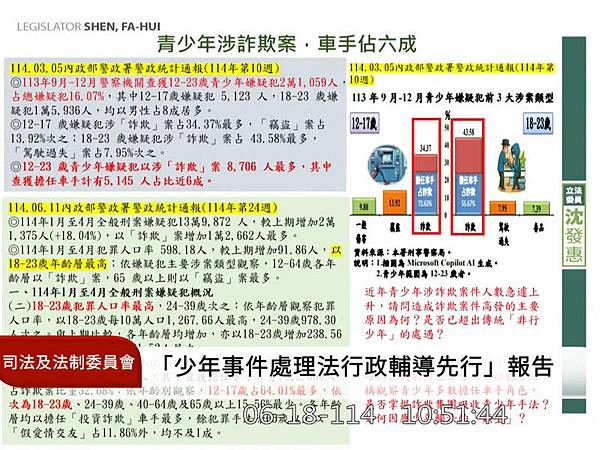 民進黨立委沈發惠質詢時指出,少年犯罪類型與以往的「飛行少年」已經大不相同。立委羅志強則指出,少子化後其實青少年人口往下掉,但犯罪人數卻更高,數字令人怵目驚心,不純粹是治安與警政問題,也有教育與社會牽連問題。青少年刑案嫌疑人達4.7萬創新高 警政署曝增加數集中在詐欺 - 社會 - 自由時報電子報 https://bit.ly/3FULfww