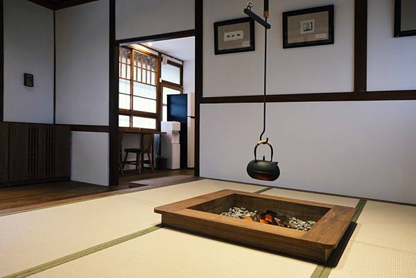 「寶桑町屋」的迎賓區域有日式榻榻米與景觀火爐,在辦理入住、退房時也能得到短暫的休憩。