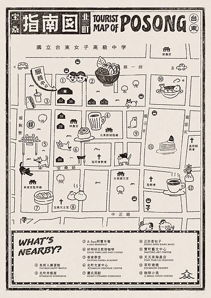 入住「寶桑町屋Machiya Posong」的旅客所供應的早餐,由雲品國際以在地共好的理念,將導流旅客去體驗台東的店家,不論是30多年的老店「正珍香包子中西早點」,或是「A-bao House 阿寶晨食館寶桑店」,都可以在入住後的翌日上午,去尋訪北町街區享受美味的台式早餐。此外,「寶桑町屋」也為旅客製作了寶桑指南圖,旅客可按圖索驥,尋訪北町街區的獨立咖啡店、北町文資中心、寶町藝文中心、草町商號等店家或景點,還可遇見在街道漫步的街貓,慢慢享受台東老街區的藝文風情。