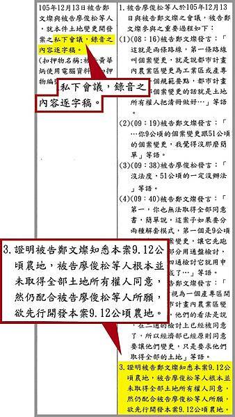 最離譜的是,廖氏父子想把9.12公頃農地變更為產業開發用地,因遲遲未取得所有地主同意,無法進行自辦市地重劃,加上該農地已經納入林口工五二通的範圍內,必須依照二通的規定推動,因此,與桃園市政府推動51公頃的區段徵收計畫是平行的,雙方在會議上各說各話,沒有交集,鄭文燦指示桃園市府官員繼續推動51公頃案的區段徵收,廖氏父子則繼續尋求其他地主同意才能自辦市地重劃,起訴書卻指鄭文燦配合業者先行開發土地,遭律師痛批入人於罪。