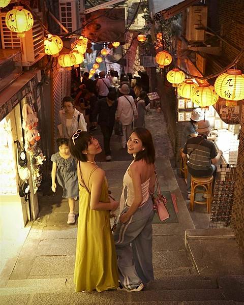 九份老街擠滿觀光客人潮,圖為越南藝人芝芙(右)。(圖/翻攝自chipupu IG)