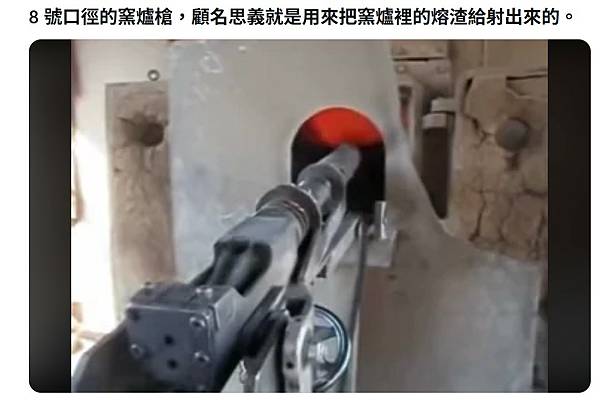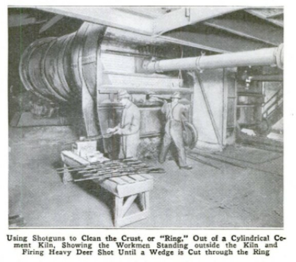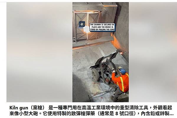 Kiln gun(窯槍) 是一種專門用在高溫工業環境中的重型清除工具,外觀看起來像小型大砲。它使用特製的散彈槍彈藥(通常是 8 號口徑),內含鉛或鋅製成的實心彈頭。窯槍的作用是發射高動能的彈頭,直接擊打在水泥窯、鍋爐或熔爐內壁上,將附著的硬化熔渣或結塊打碎,使其脫落,達到快速清理的效果。