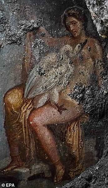 根據《每日郵報》報導,由於過去數年的雨水與磨損,導致古蹟坍塌露出壁畫,上面紀載了一則希臘神話,內容是關於斯巴達的麗達王妃(Leda)被宙斯(Zeus)幻化的天鵝所挑逗的故事。龐貝考古區主任Massimo Osanna表示,這是龐貝城室內設計中的一個常見主題,但該幅壁畫的特殊性在於明顯的感性色彩,「王妃就像在凝視看著壁畫的每個人」。