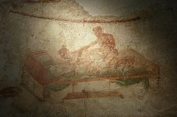 ▲龐貝古城出土神明在床上雲雨的壁畫。(圖/翻攝自龐貝古城考古公園網站)