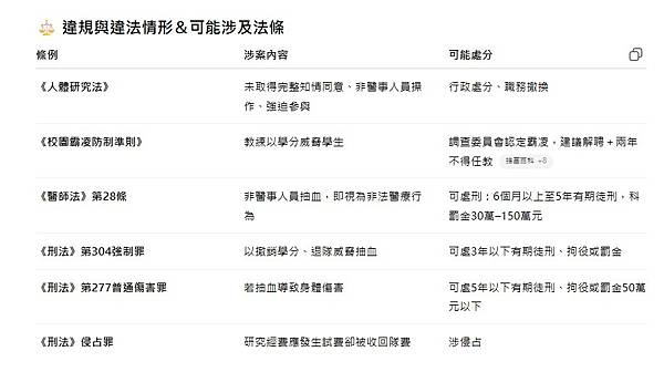 此外,人體研究應經由學校研究倫理委員會(IRB)審查並由醫事專業人員執行,但此案完全未達法定要求,且抽血程序與操作均缺乏監督與合法性