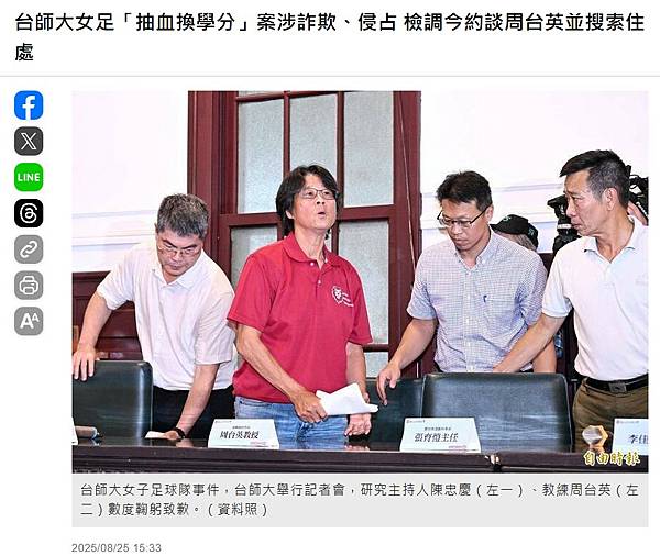 "台師大女足「抽血換學分」案涉詐欺、侵占 檢調今約談周台英並搜索住處 - 社會 - 自由時報電子報" https://news.ltn.com.tw/news/society/breakingnews/5155765