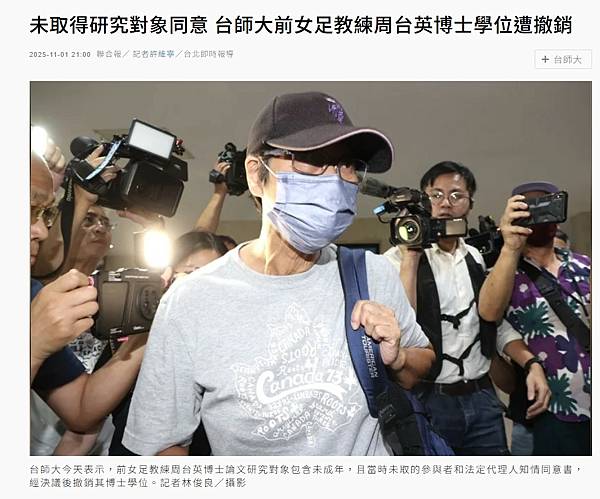 "未取得研究對象同意 台師大前女足教練周台英博士學位遭撤銷 | 文教新訊 | 文教 | 聯合新聞網" https://udn.com/news/story/6885/9111564