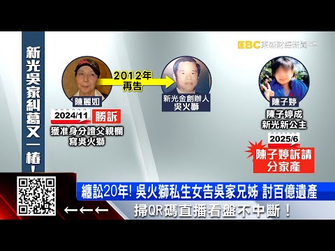 新光集團創辦人吳火獅於1986年過世,婦人陳麗如2004年帶著女兒陳子婷認祖歸宗,稱陳女是吳火獅的非婚生子女,要求新光吳家負責,親子關係訴訟歷經多年,陳子婷於2024年底獲最高法院判決確認為吳火獅之女,並於今年6月向法院聲請分配吳火獅的遺產,雙方將於本月24日開庭調解。
