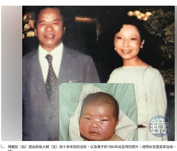 陳麗如(右)提出與吳火獅(左)四十多年前的合影,以及陳子婷1984年出生時的照片,證明女兒是吳家血緣。(讀者提供)