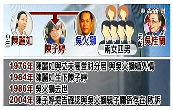 本刊調查,2005年1月吳火獅已過世19年,突然被爆婚外產女,陳子婷母親陳麗如當時提告確認親子關係存在之訴。陳麗如自稱曾與大她30歲的吳火獅交往,並於1984年為他生女,唯雙方各有配偶,訴訟過程中,法院曾請吳火獅的女兒吳如月及吳如英赴調查局,與陳子婷進行DNA比對,但遭到拒絕,陳麗如還一度要求法院開棺驗吳火獅遺骨DNA,引發社會熱議。