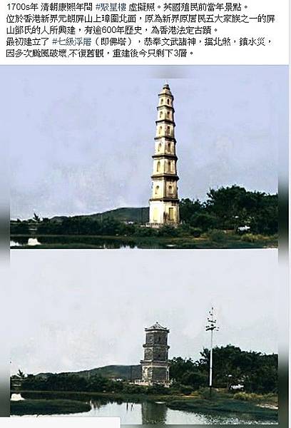 1700s年 清朝康熙年間 #聚星樓 虚擬照。英國殖民前當年景點。位於香港新界元朗屏山上璋圍北面,原為新界原居民五大家族之一的屏山鄧氏的人所興建,有逾600年歷史,為香港法定古蹟。最初建立了 #七級浮屠(即佛塔),恭奉文武諸神,擋北煞,鎮水災,因多次颱風破壞,不復舊觀,重建後今只剩下3層