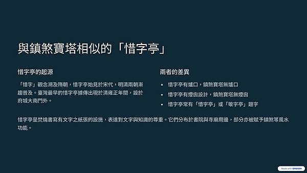 惜字亭有爐口、煙囪的設計,鎮煞寶塔並沒有,而鎮煞寶塔頂部有各種神明,但惜字亭的神位或神像通常在最上層
