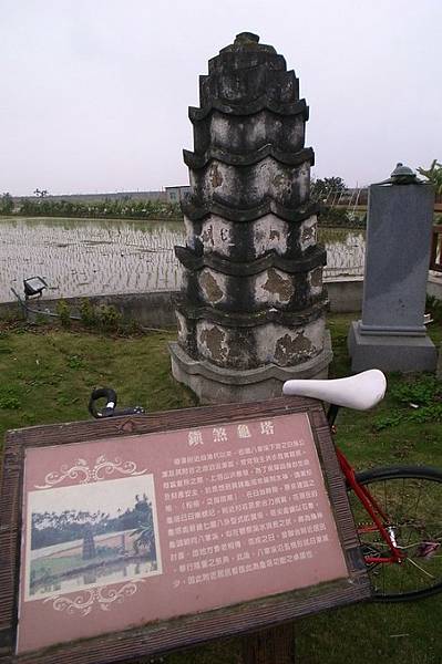 入碧潭村,在農田上有一個顯眼的鎮煞龜塔。清代以來,八掌溪下游及附近湖泊常常發生洪水,於是先民建造龜塔鎮制水神,日治時期重建成七層八卦式的寶塔,塔尖上有石龜,龜臉朝向八掌溪,意在觀察溪水消長。| https://newbrue.pixnet.net/blog/post/166471152
