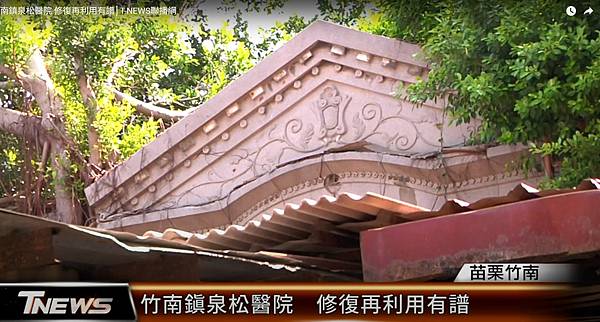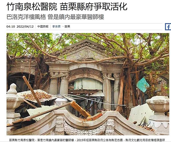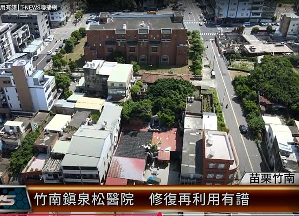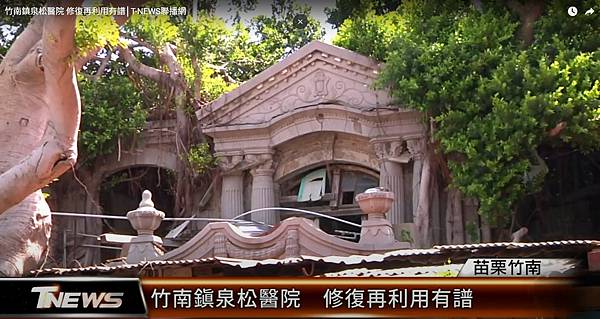 竹南泉松醫院於1929年竣工,是苗栗竹南當地知名醫師方泉松的醫院與宅邸,正面有五開間,樓高兩層,外觀具有豐富西洋歷史語彙,有西洋柱式和車寄,非常華麗,當時醫院還有x光檢驗室,是當時最先進的設備。現址為苗栗縣竹南鎮迎薰路82號,雖然已受登錄為縣定古蹟,不過內部目前仍呈現破敗狀態尚未修復 5 守法街 - Google 地圖