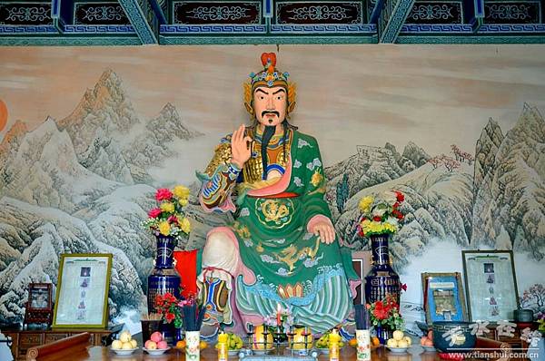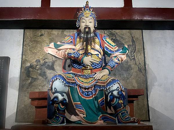 我們懷著肅穆崇敬的心情拜諳了姜公祠。姜軍說,第一步台階,共有9級,代表姜維九伐中原;再往前是第二步台階,由18級組成,代表姜維距現在已經1800多年。進得大殿,他又指著正中的高大塑像說:“這塑像高2.7米,寓意姜維27歲時跟隨諸葛亮徵戰疆場。大殿兩側的36幅壁畫則描寫了姜維英雄的一生。”