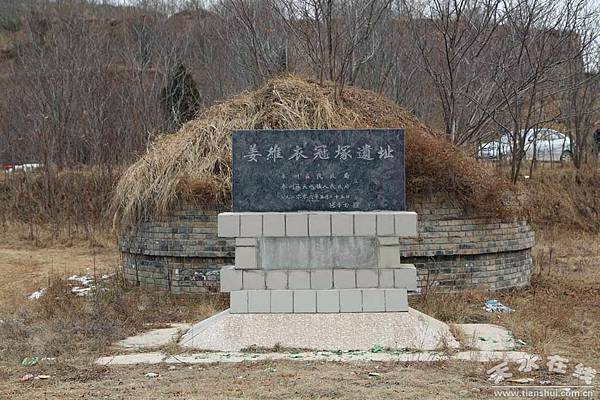 姜維墓在距甘谷縣城東5公里姜家莊的將軍嶺上,佔地面積6000平米,有姜維衣冠塚和仿古歇山頂紀念館一座,內塑將軍坐像,有楊成武將軍題「姜維墓」石碑。