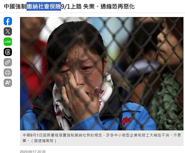 "中國強制繳納社會保險9/1上路 失業、通縮恐再惡化 - 國際 - 自由時報電子報" https://news.ltn.com.tw/news/world/breakingnews/5147106