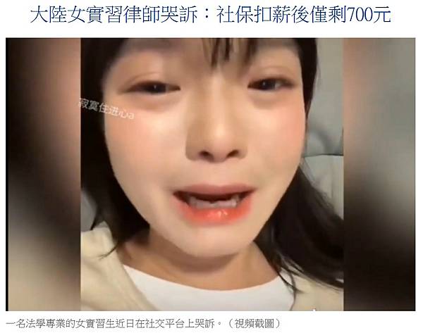 在中國社群媒體上,無論是小企業主或是員工都叫苦連天。一名法學院畢業、在律師事務所工作的女生哭訴的影片在網路熱傳,她說,老闆表示她的社保要從她薪資中扣,原本2500元的薪資扣完1800元的社保,只剩700元,等於每天只賺31元,「我每天都在付費上班」、「真的要活不起了」。若不交社保,無法當實習律師,更無法取得律師證成為執業律師。