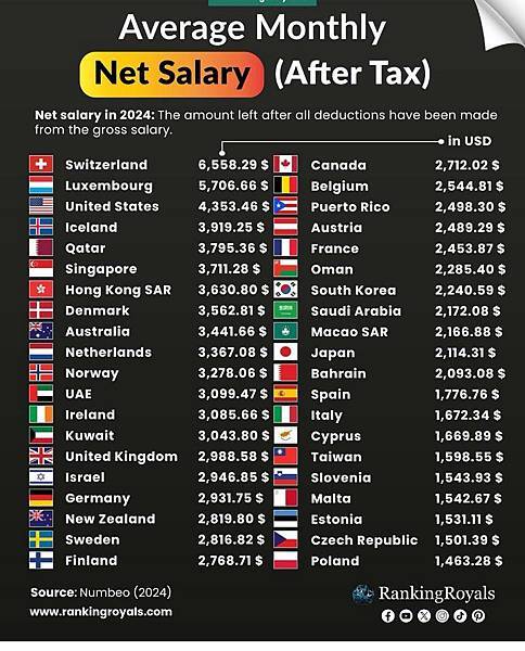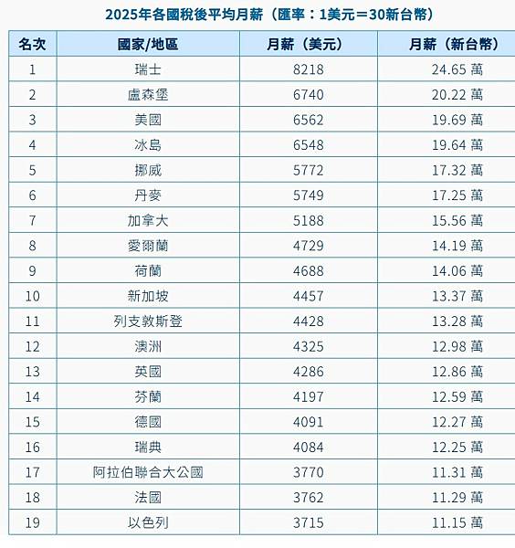 商業雜誌《CEOWORLD》針對全球197個國家及地區,統計扣除各項稅金與保費後實際可支配的「稅後平均薪資」,並根據該數字列出排名。調查顯示,「2025年各國稅後平均月薪」榜首依舊由瑞士奪下,平均月薪高達8218美元(約新台幣24.6萬元),遙遙領先其他國家;緊隨其後的盧森堡、美國與冰島,月薪皆超過新台幣19萬元。前十名幾乎由歐美國家壟斷,包括挪威、丹麥、加拿大、愛爾蘭與荷蘭,唯一擠進榜單的亞洲經濟體是新加坡,平均月薪4457美元(約新台幣13.3萬元)。
