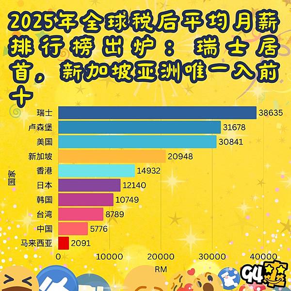 外國商業雜誌《CEOWORLD》公佈「2025年各國稅後平均月薪」排名,涵蓋全球197個國家與地區。報告顯示,瑞士以8,218美元(約38,600令吉)蟬聯榜首,成為全球收入最高國家。其次是盧森堡6,740美元(約31,700令吉),以及美國6,562美元(約30,850令吉)。前十名幾乎由歐美國家包攬,唯一進入榜單的亞洲國家是新加坡,以4,457美元(約20,950令吉)排在第十。