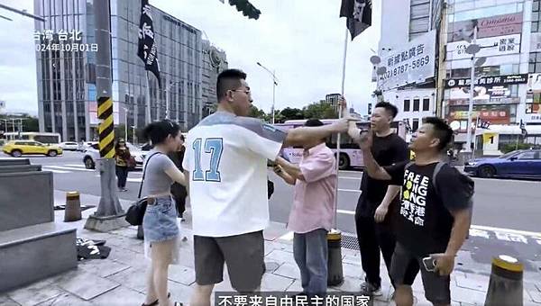 在台港人趁10月1日中國國慶在西門町舉辦香港國殤活動,竟有中國遊客(左)鬧場,雙方爆發口角。(圖擷取自《自由亞洲電台》)