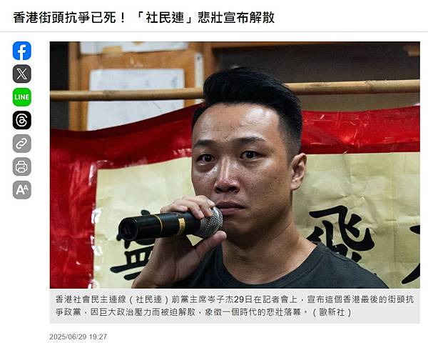 香港公民社會的寒冬,再迎來一個令人心碎的時刻。根據《美聯社》報導,香港最後一個仍敢於不時走上街頭抗議的民主派政黨「社會民主連線」(社民連),於29日宣布,因面臨巨大的政治壓力,在別無選擇下決定解散。這標誌著一個時代的終結,香港曾經充滿活力的街頭抗爭政治,至此正式落幕。社民連主席陳寶瑩在記者會上數度拭淚,她表示,解散是經過審慎考量後的沉痛決定,特別是考慮到對成員與戰友可能帶來的後果。香港街頭抗爭已死! 「社民連」悲壯宣布解散 - 國際 - 自由時報電子報 https://bit.ly/447O9XZ